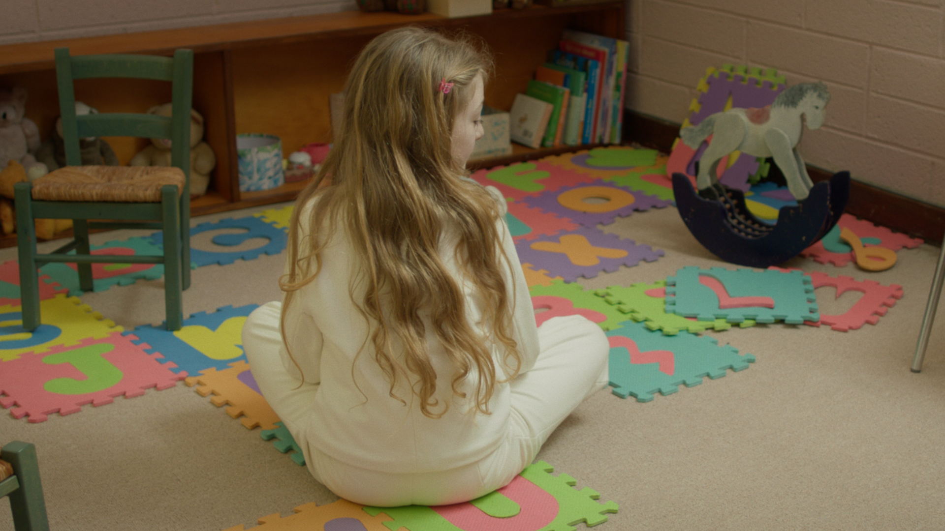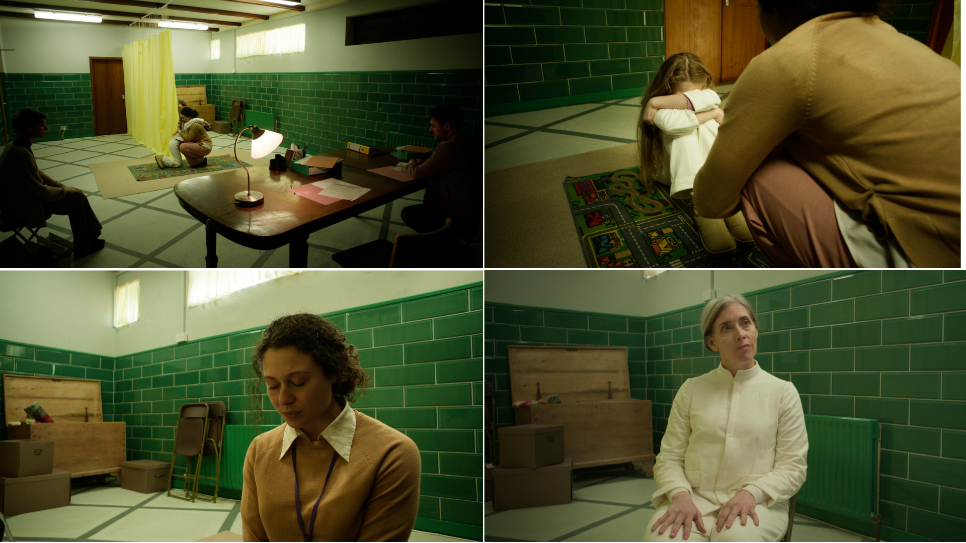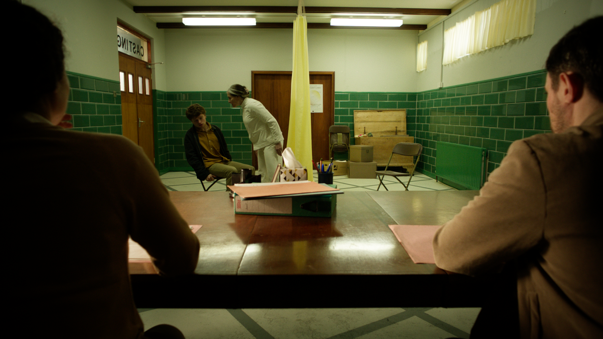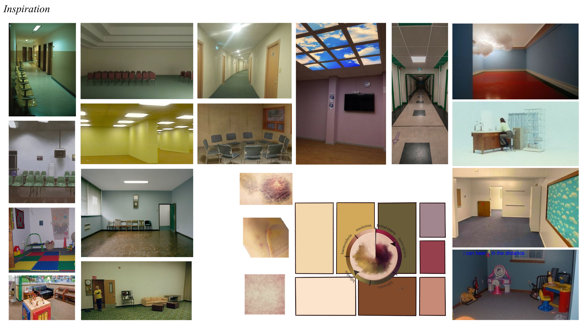 My design was inspired by liminal spaces, those eerie, transitional environments that feel neither here nor there. For the fictional Grief Centre, we aimed to make everything feel subtly off, from the unsettling emptiness of the space to the colour palette, which was drawn from the shifting hues of bruises, purples, greens, and yellows, to echo the emotional stages of grief. I also created a range of in-world graphics to help build the identity of the centre and add depth to the environment. In total, I designed, sourced and dressed the Waiting Room, Casting Room, Bathroom, Angels’ Room, Waiting Room, and the hallways.