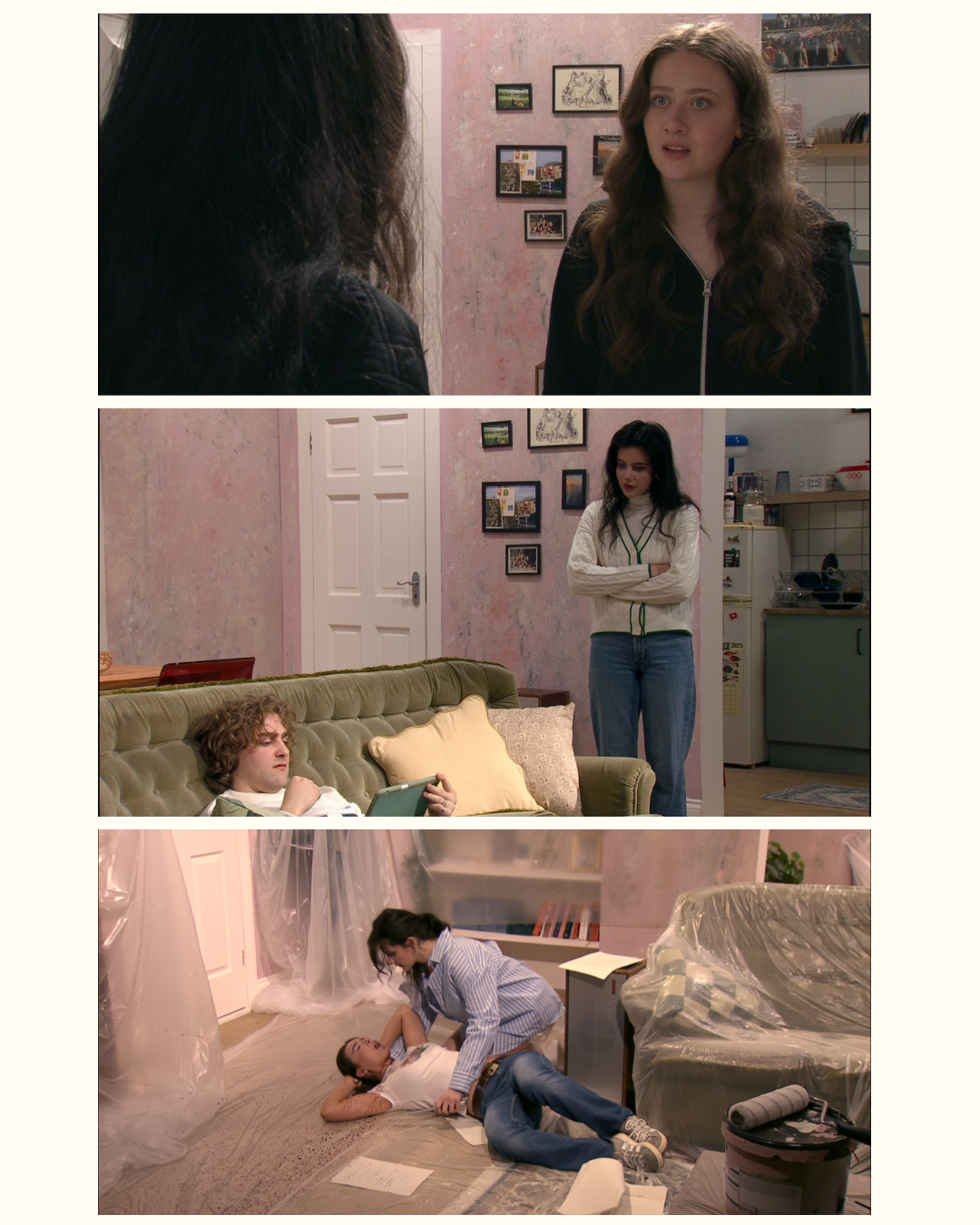 We were involved in the full art department process from initial research and concept development through to construction, painting, dressing and on-set adjustments during filming. The casting office was designed as a clean, structured environment that contrasted with the more personal and worn-in apartment, which drew on Georgian interiors in Dublin and reflected the lives of the characters living there.