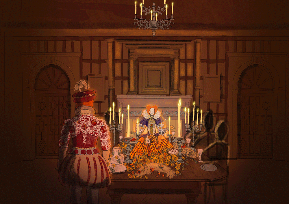 With my main focus on a historical but also very expressive set and costume, I designed a "sugarcourse" in a Banquet hall inspired by Elizabethan Architecture. I first created concept art for both the set and the costumes of Orlando and Elizabeth. I then made a 1:25 model with Autocad and a Laser cutter, which I then painted and decorated to fit the historical visual research.