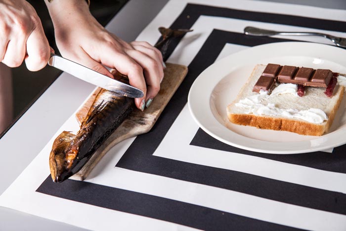 You might ask yourself what a sandwich has to do with any graphic design? Camille Ammann and I wanted to create something which would stay in peoples minds and would have the chance to go viral. Since there are a lot of short cooking videos all over social media, we decided to cook our poster in words made out of different foods that may or may not go so well together.