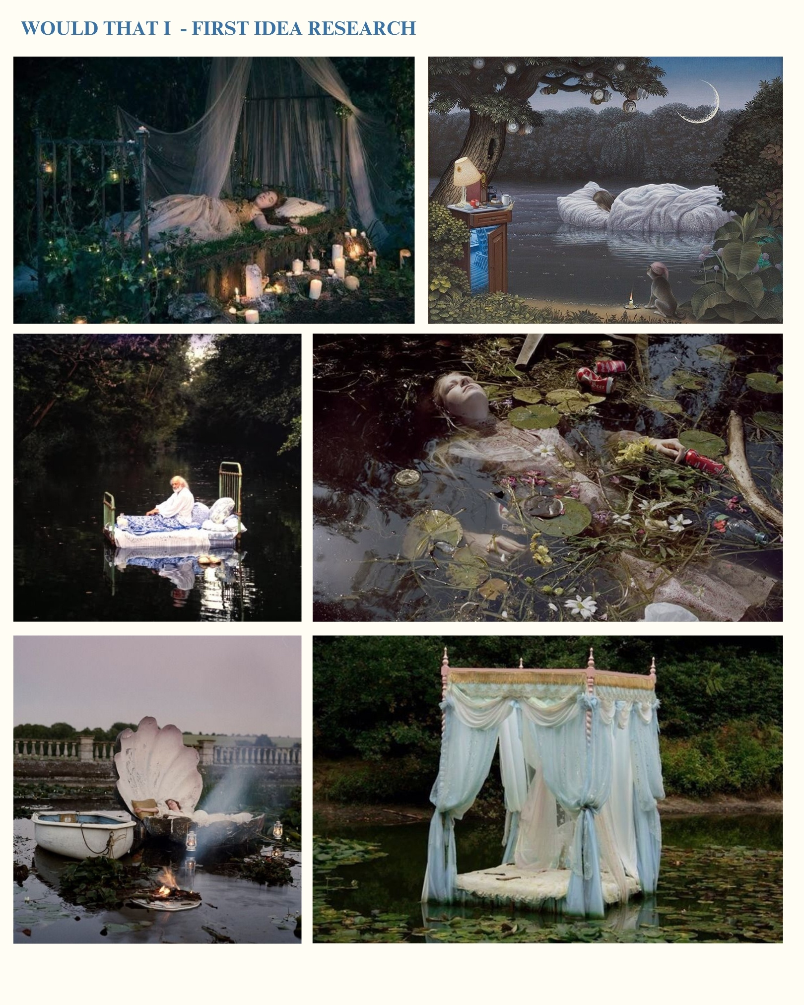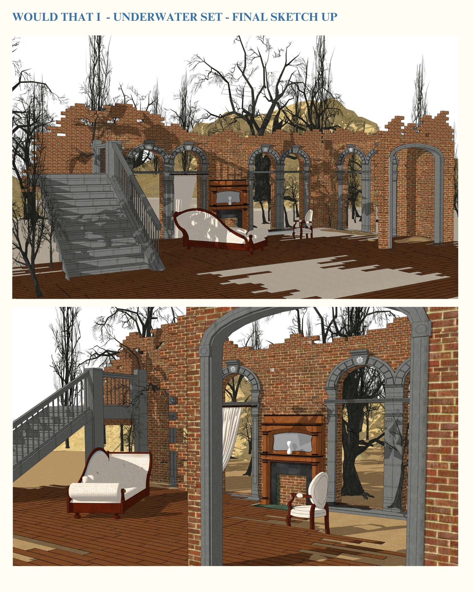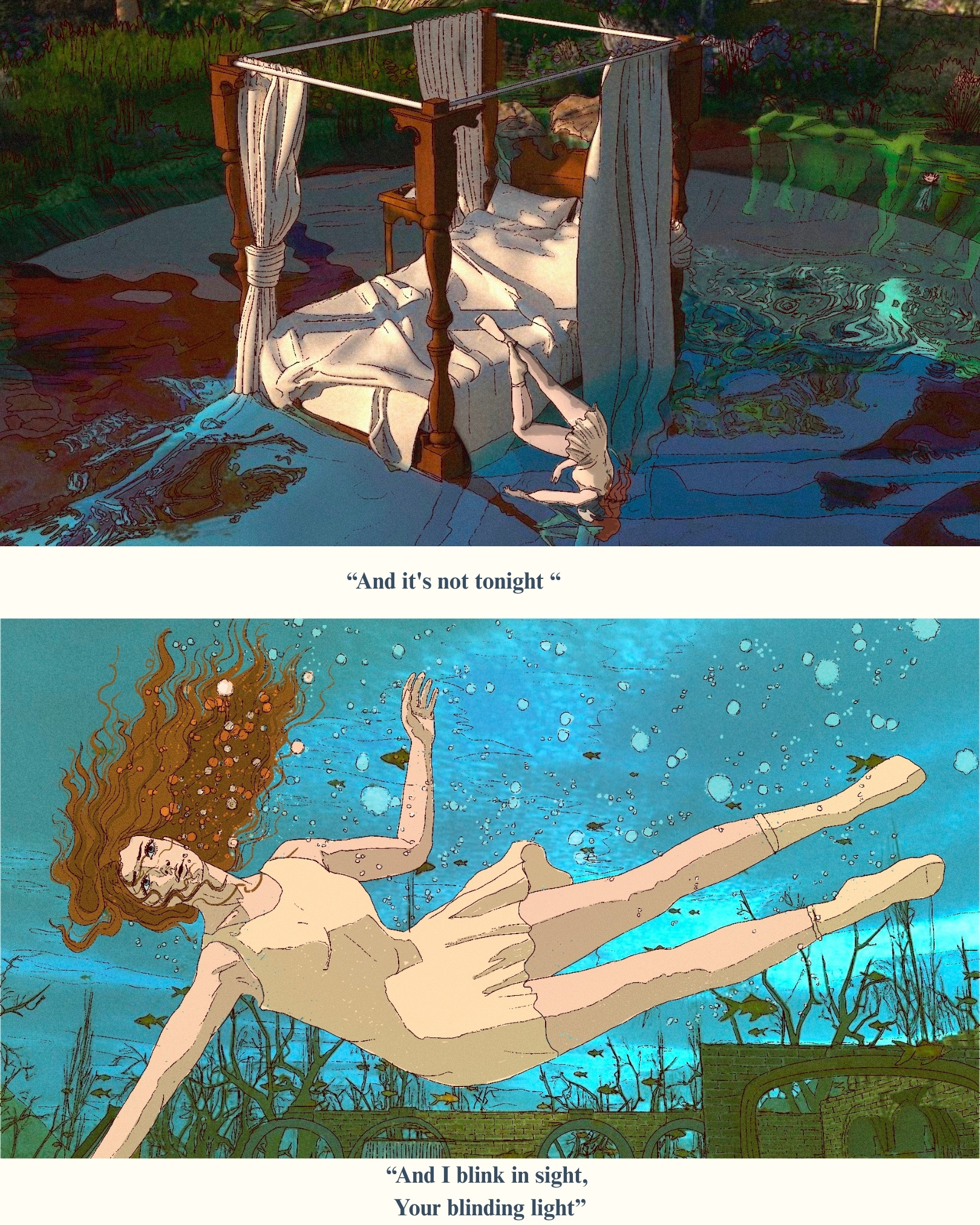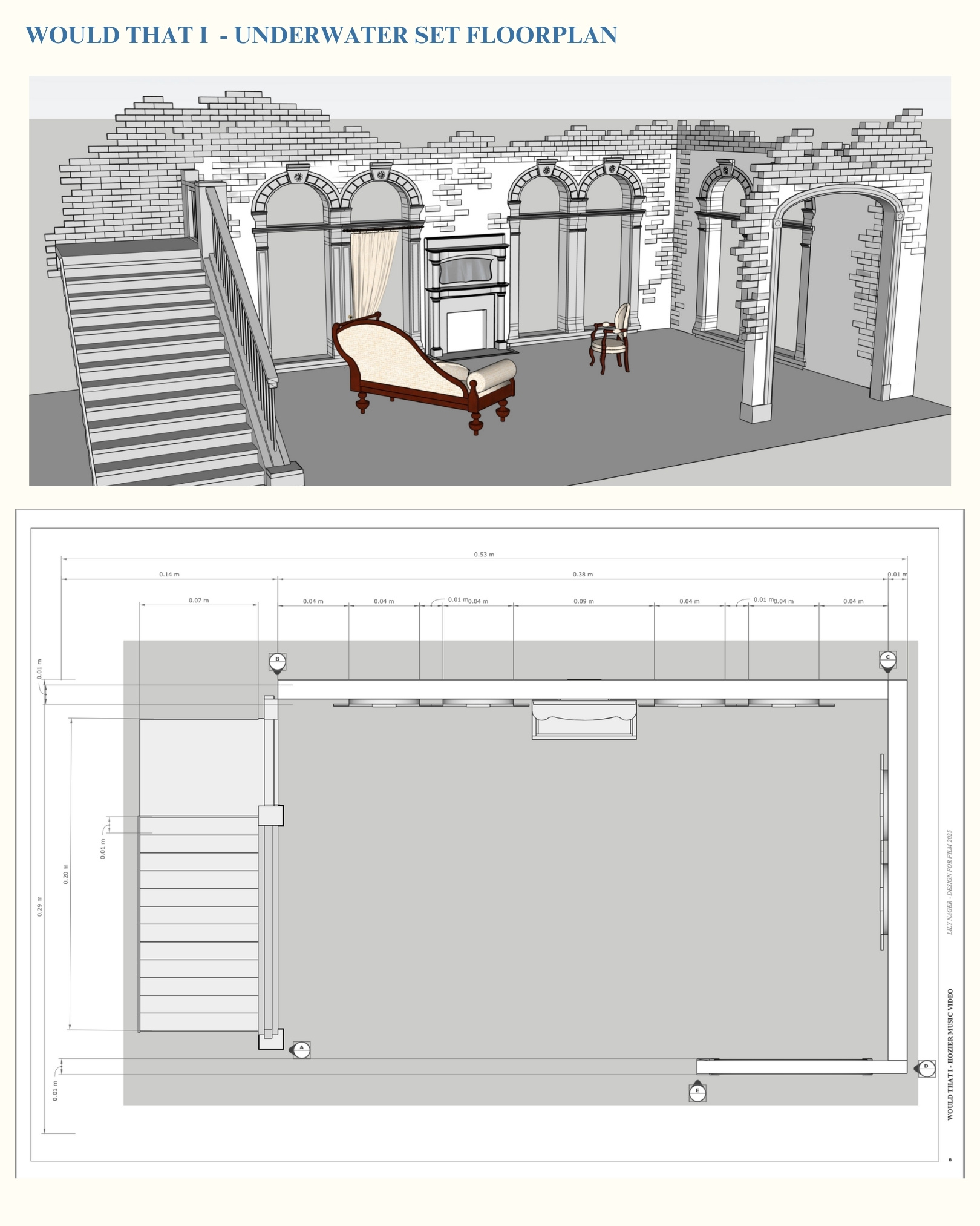 The lyrics inspired a story connected to nature, with strong visual elements of water and fire. My goal was to use SketchUp and V-Ray in an illustrative way to create concept art for two dreamlike sets. The first features a bed floating in a pond, surrounded by nature and ruins, loosely inspired by "Die Toteninsel" by Swiss painter Arnold Böcklin. The second set, underwater, depicts the ruins of a burnt Victorian house. Both designs draw from Victorian-era references and paintings, particularly in the character’s look, which was heavily inspired by Ophelia by Sir John Everett Millais.