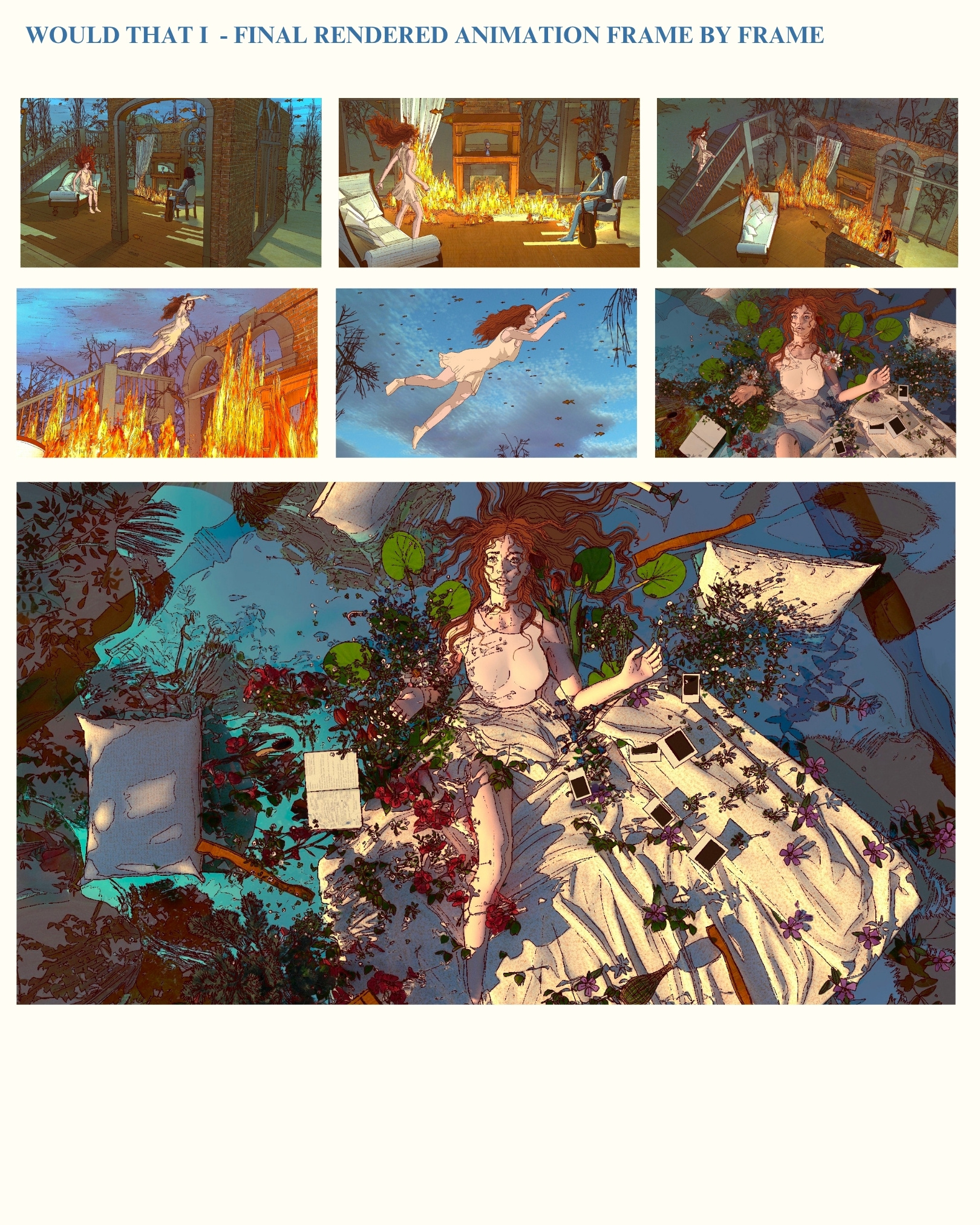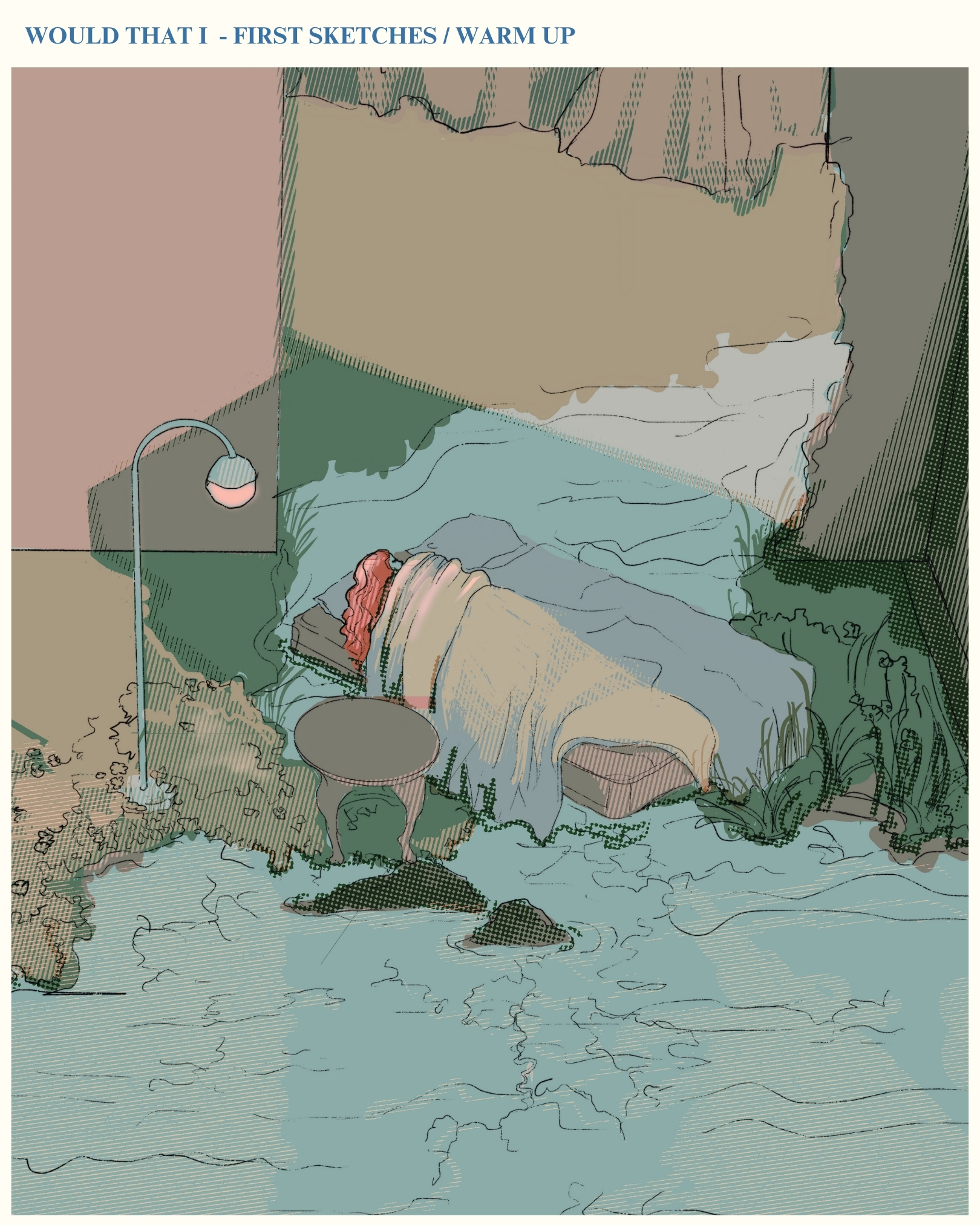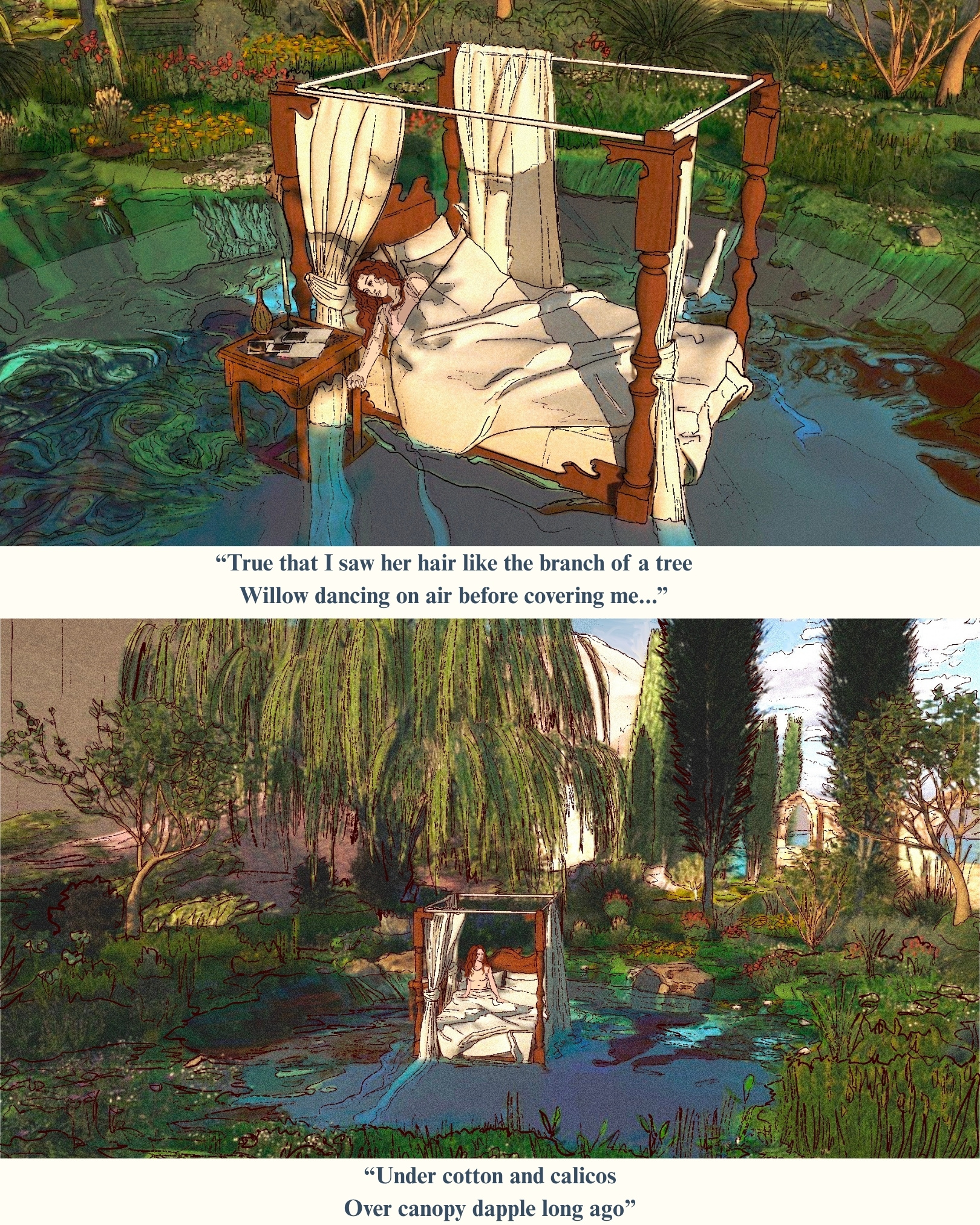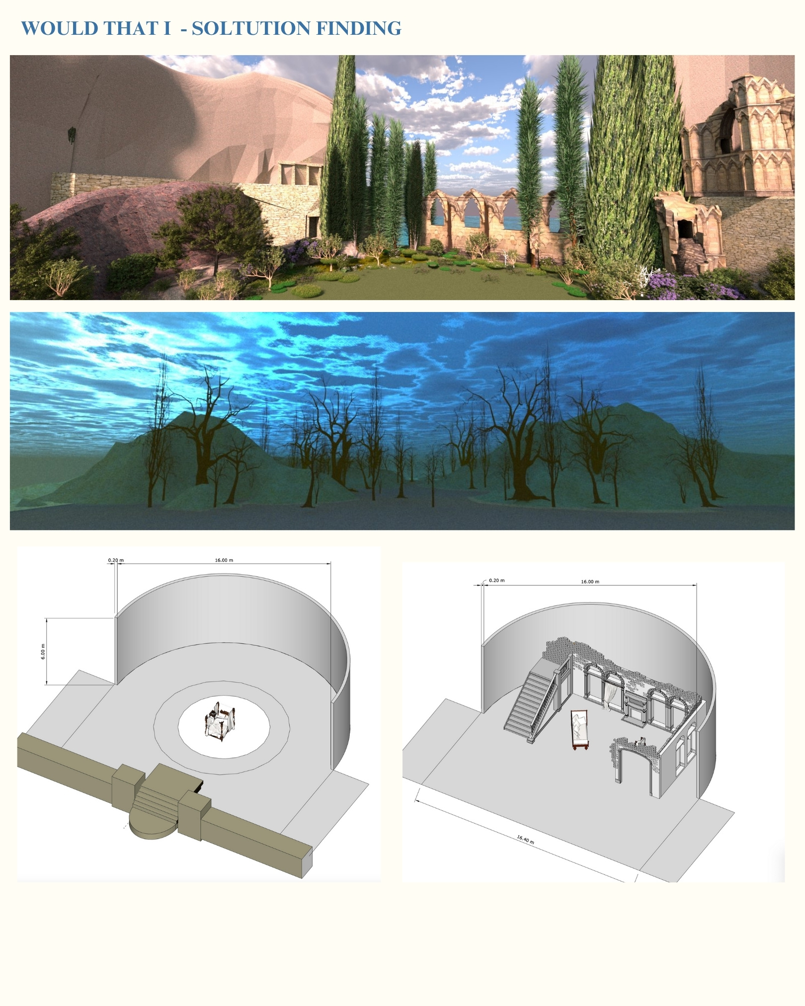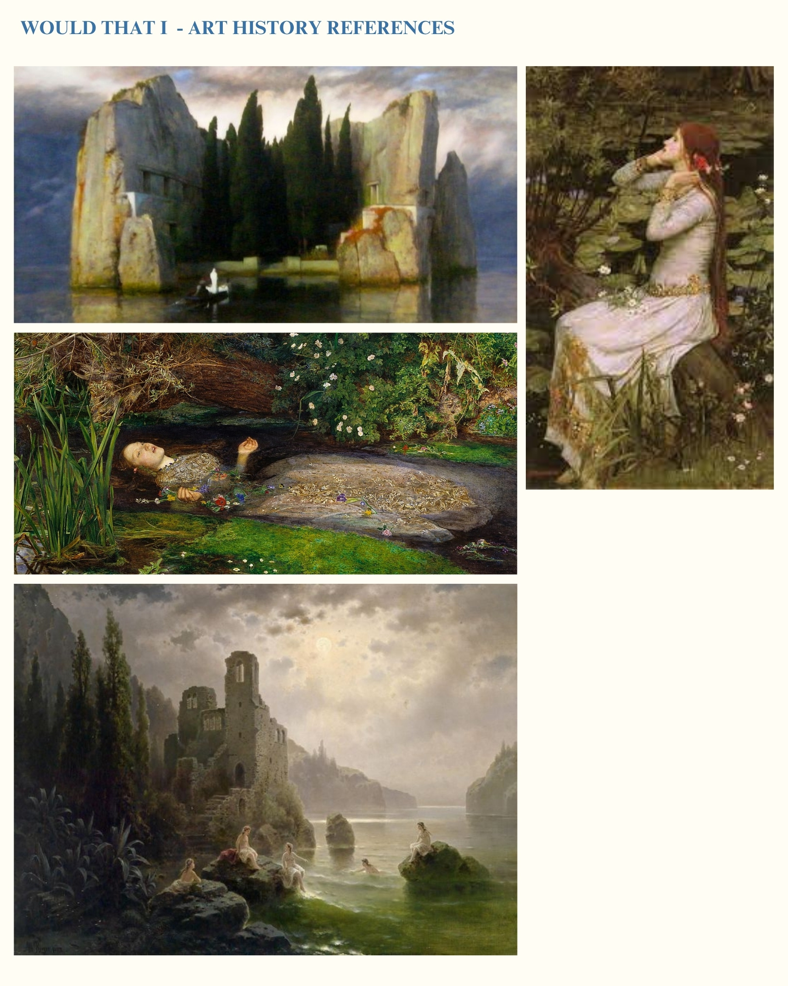 The lyrics inspired a story connected to nature, with strong visual elements of water and fire. My goal was to use SketchUp and V-Ray in an illustrative way to create concept art for two dreamlike sets. The first features a bed floating in a pond, surrounded by nature and ruins, loosely inspired by "Die Toteninsel" by Swiss painter Arnold Böcklin. The second set, underwater, depicts the ruins of a burnt Victorian house. Both designs draw from Victorian-era references and paintings, particularly in the character’s look, which was heavily inspired by Ophelia by Sir John Everett Millais.
