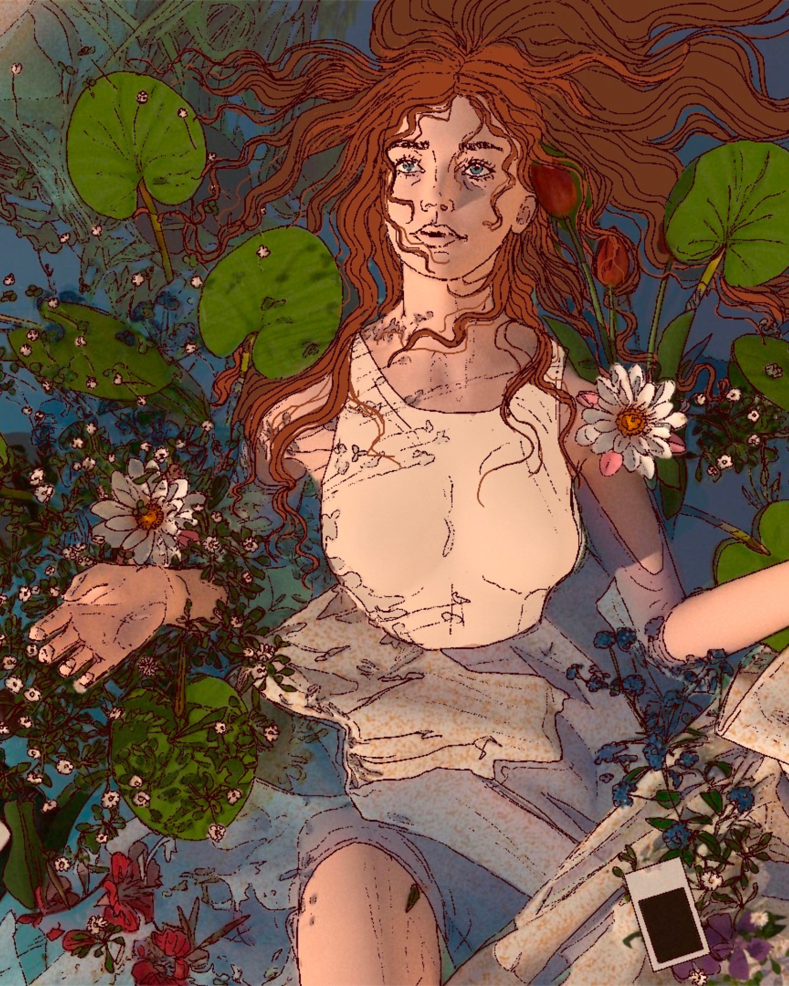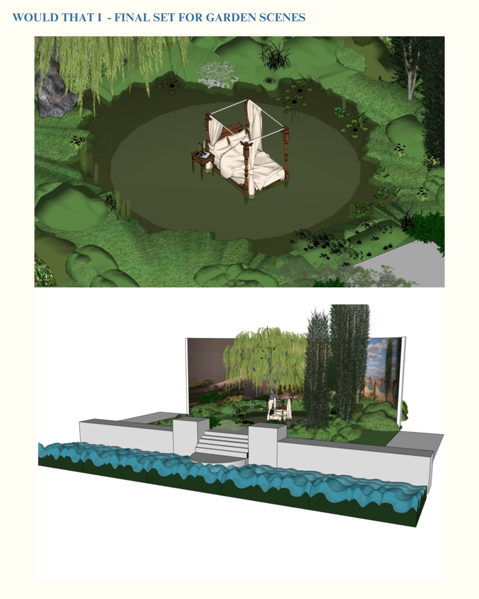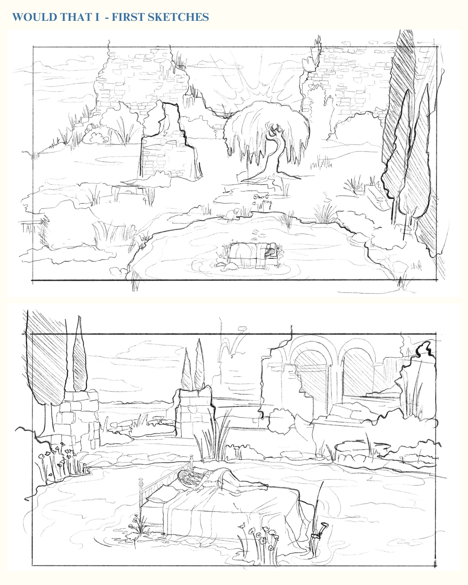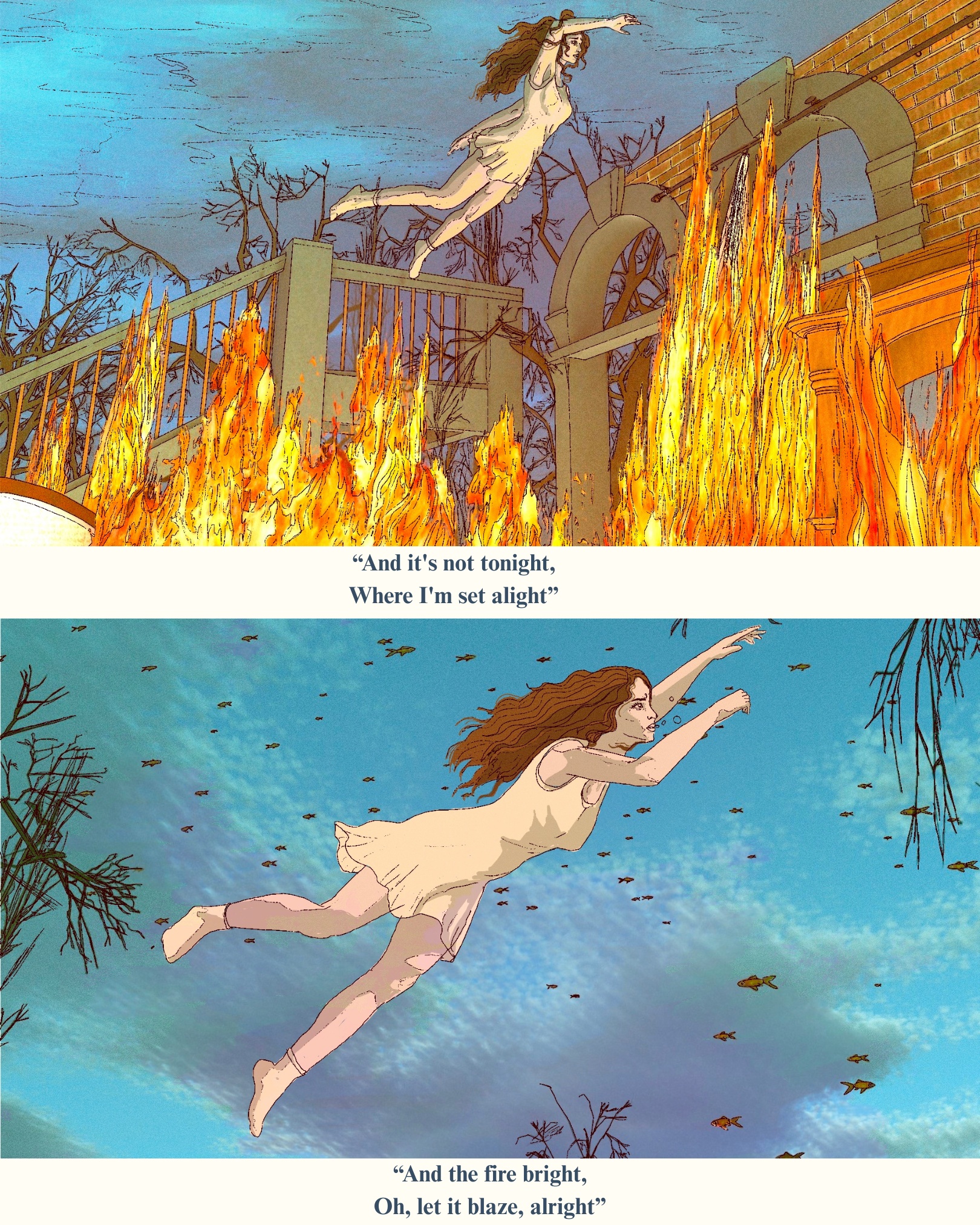 The lyrics inspired a story connected to nature, with strong visual elements of water and fire. My goal was to use SketchUp and V-Ray in an illustrative way to create concept art for two dreamlike sets. The first features a bed floating in a pond, surrounded by nature and ruins, loosely inspired by "Die Toteninsel" by Swiss painter Arnold Böcklin. The second set, underwater, depicts the ruins of a burnt Victorian house. Both designs draw from Victorian-era references and paintings, particularly in the character’s look, which was heavily inspired by Ophelia by Sir John Everett Millais.