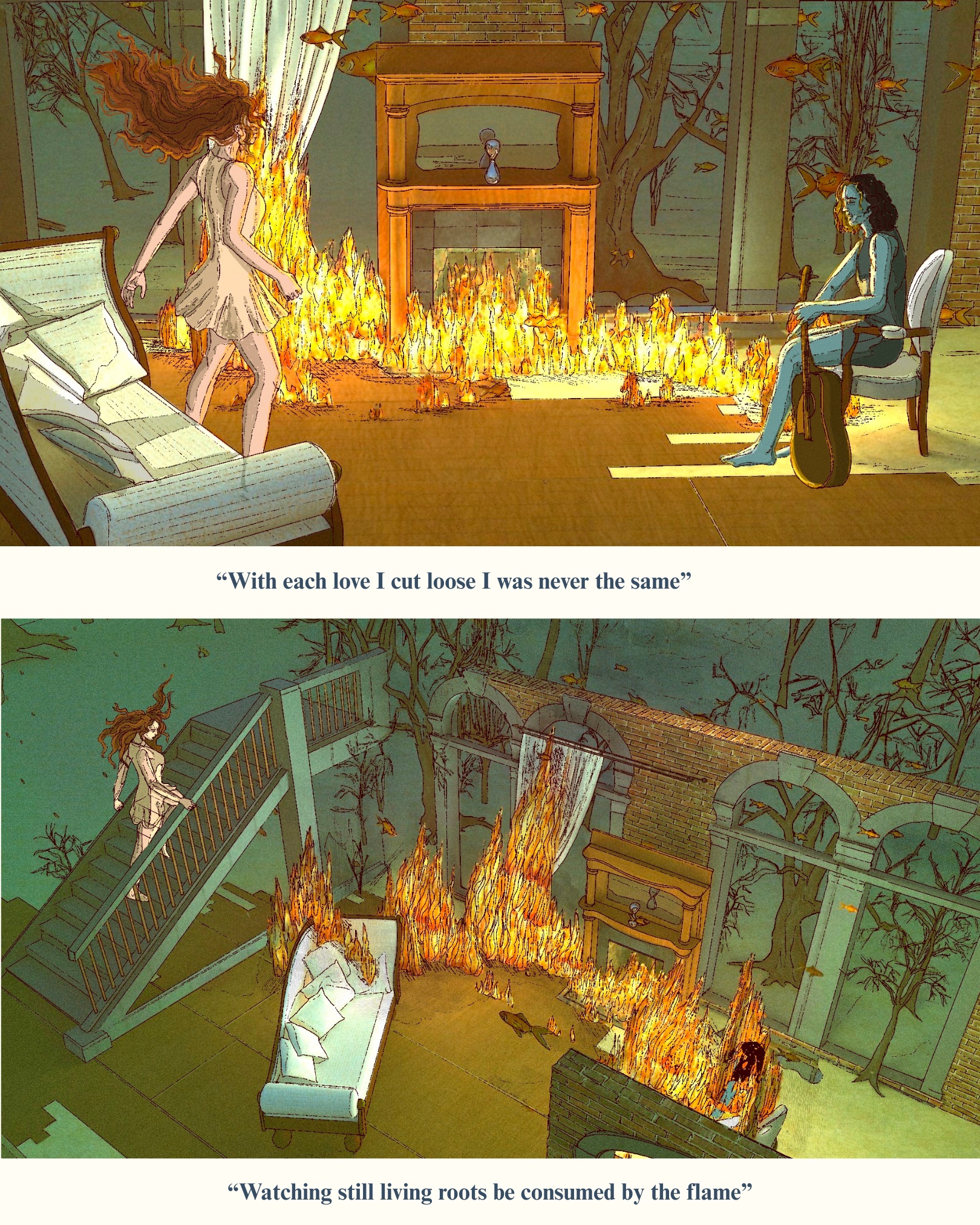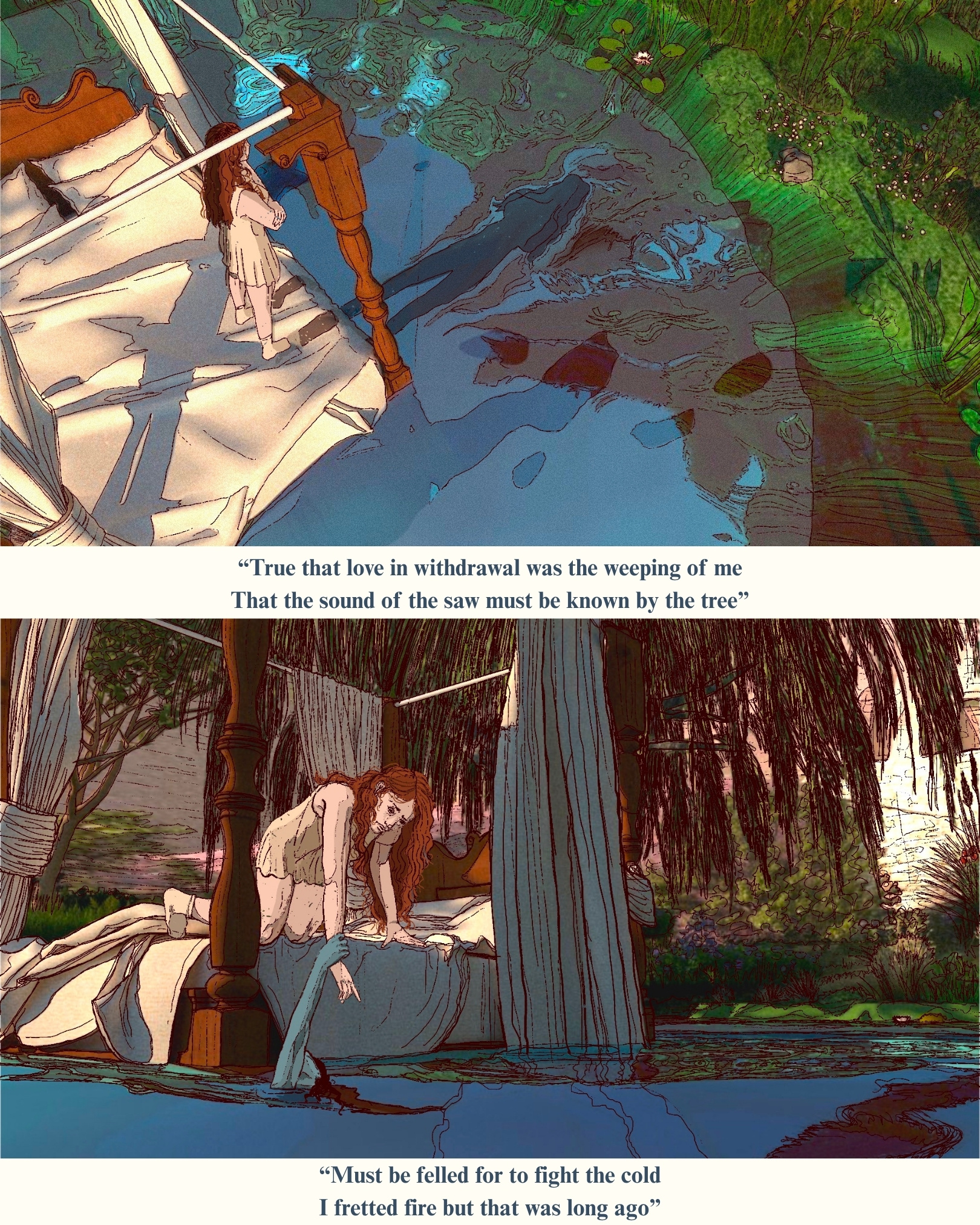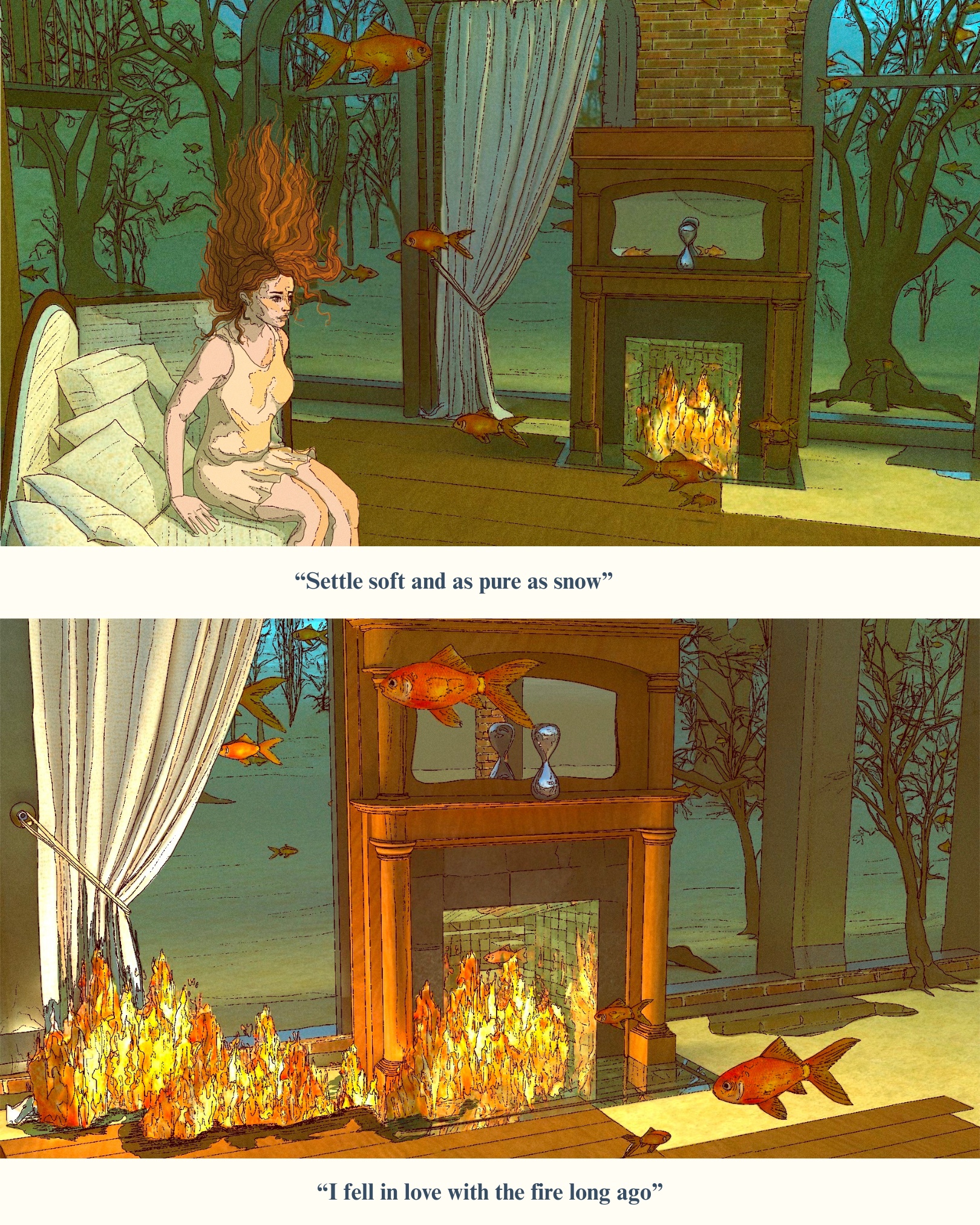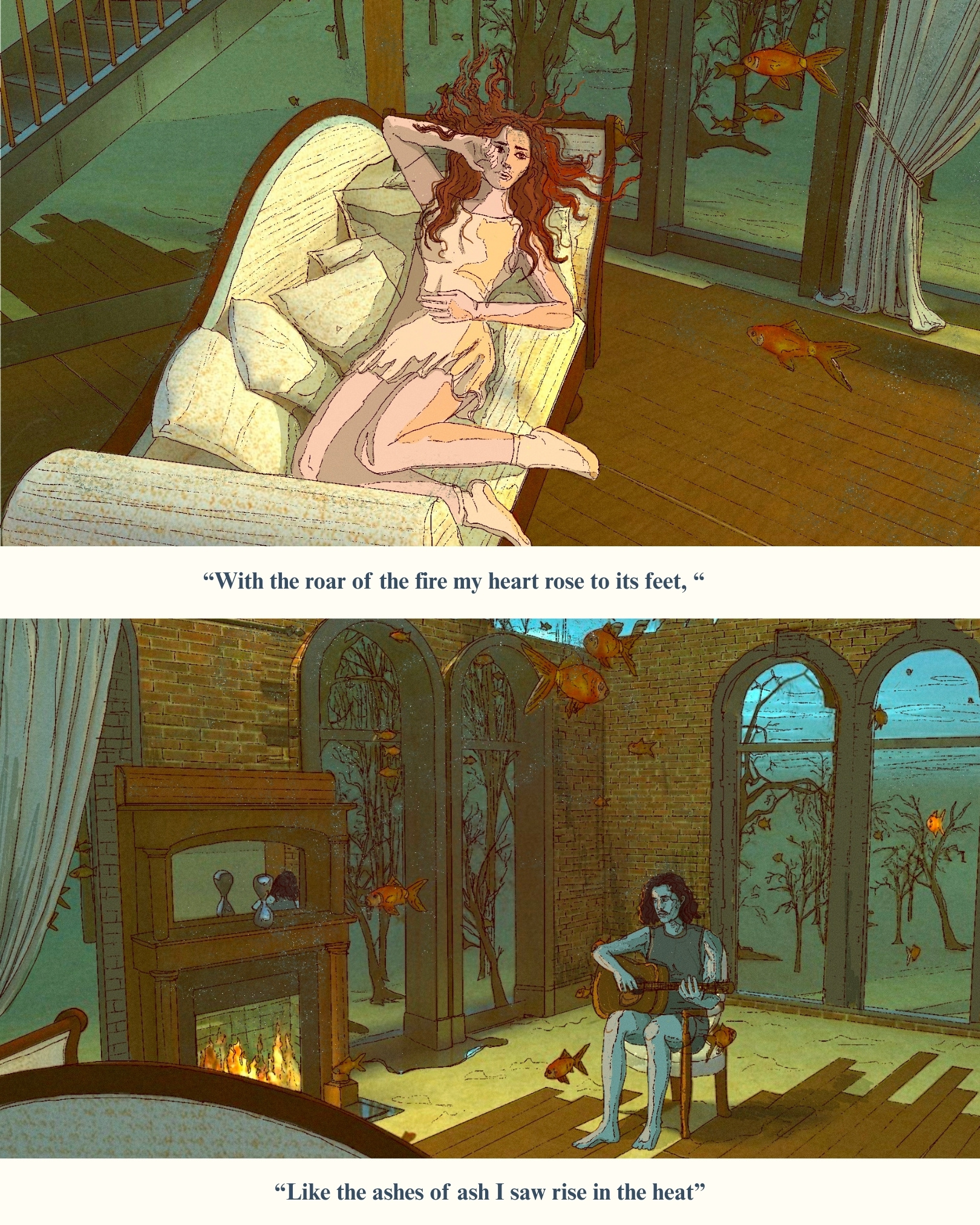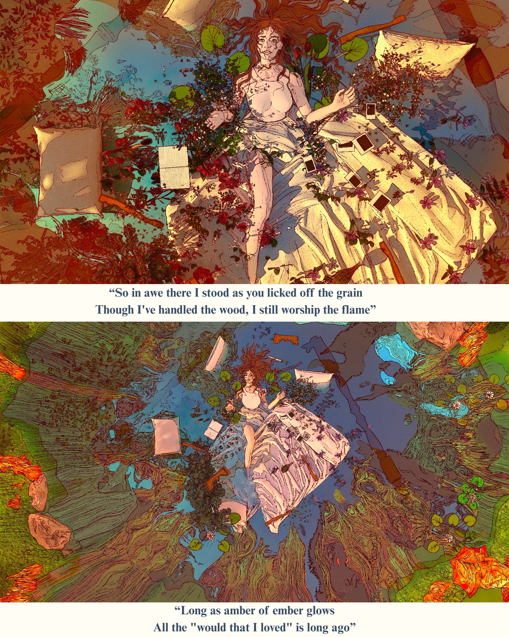 The lyrics inspired a story connected to nature, with strong visual elements of water and fire. My goal was to use SketchUp and V-Ray in an illustrative way to create concept art for two dreamlike sets. The first features a bed floating in a pond, surrounded by nature and ruins, loosely inspired by "Die Toteninsel" by Swiss painter Arnold Böcklin. The second set, underwater, depicts the ruins of a burnt Victorian house. Both designs draw from Victorian-era references and paintings, particularly in the character’s look, which was heavily inspired by Ophelia by Sir John Everett Millais.